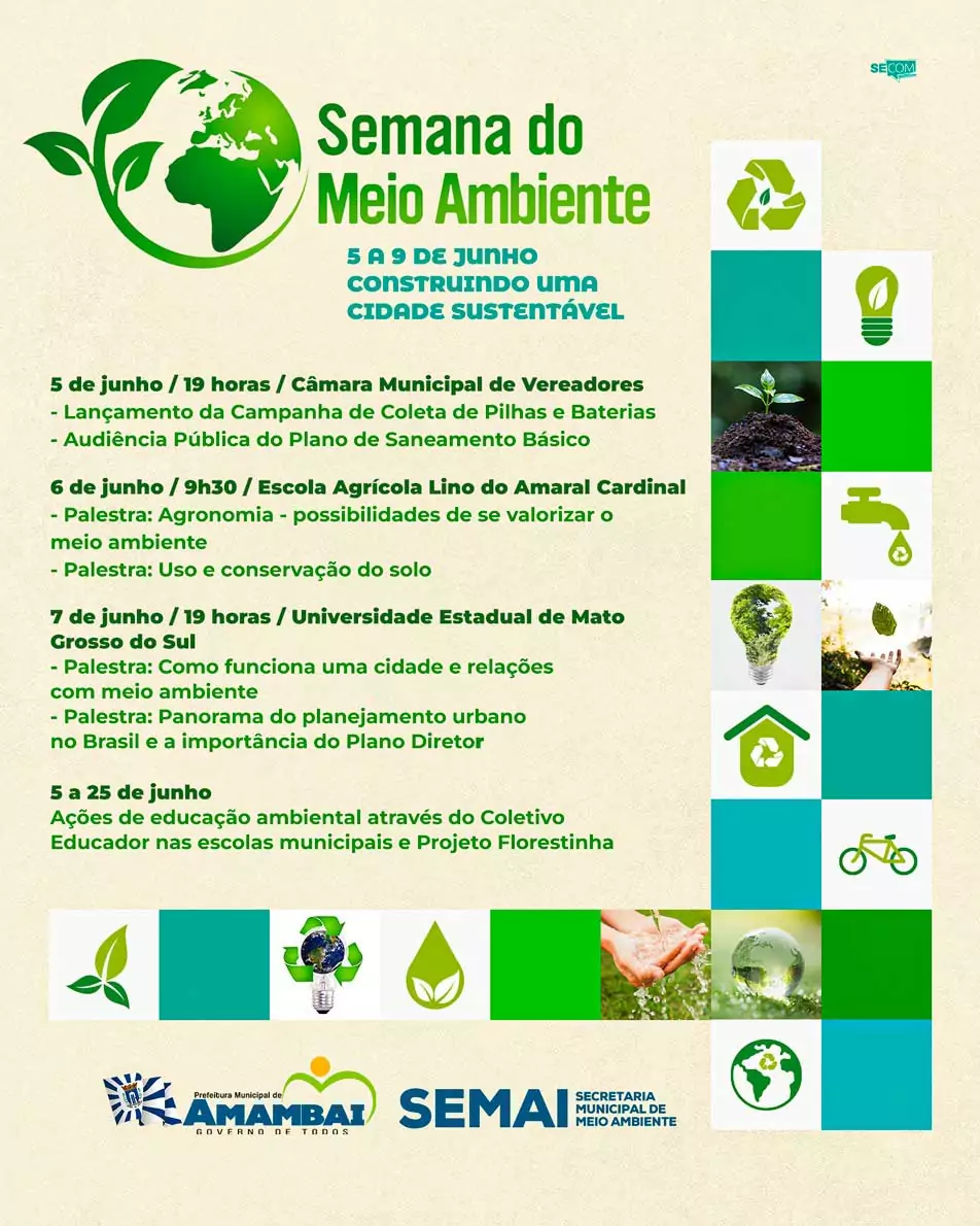 As atividades terão início nesta segunda-feira, 5 de junho, na Câmara Municipal de Vereadores às 19 horas com o lançamento da Campanha de Coleta de Pilhas e Baterias e a 1ª Audiência Pública do Plano de Saneamento Básico de Amambai.