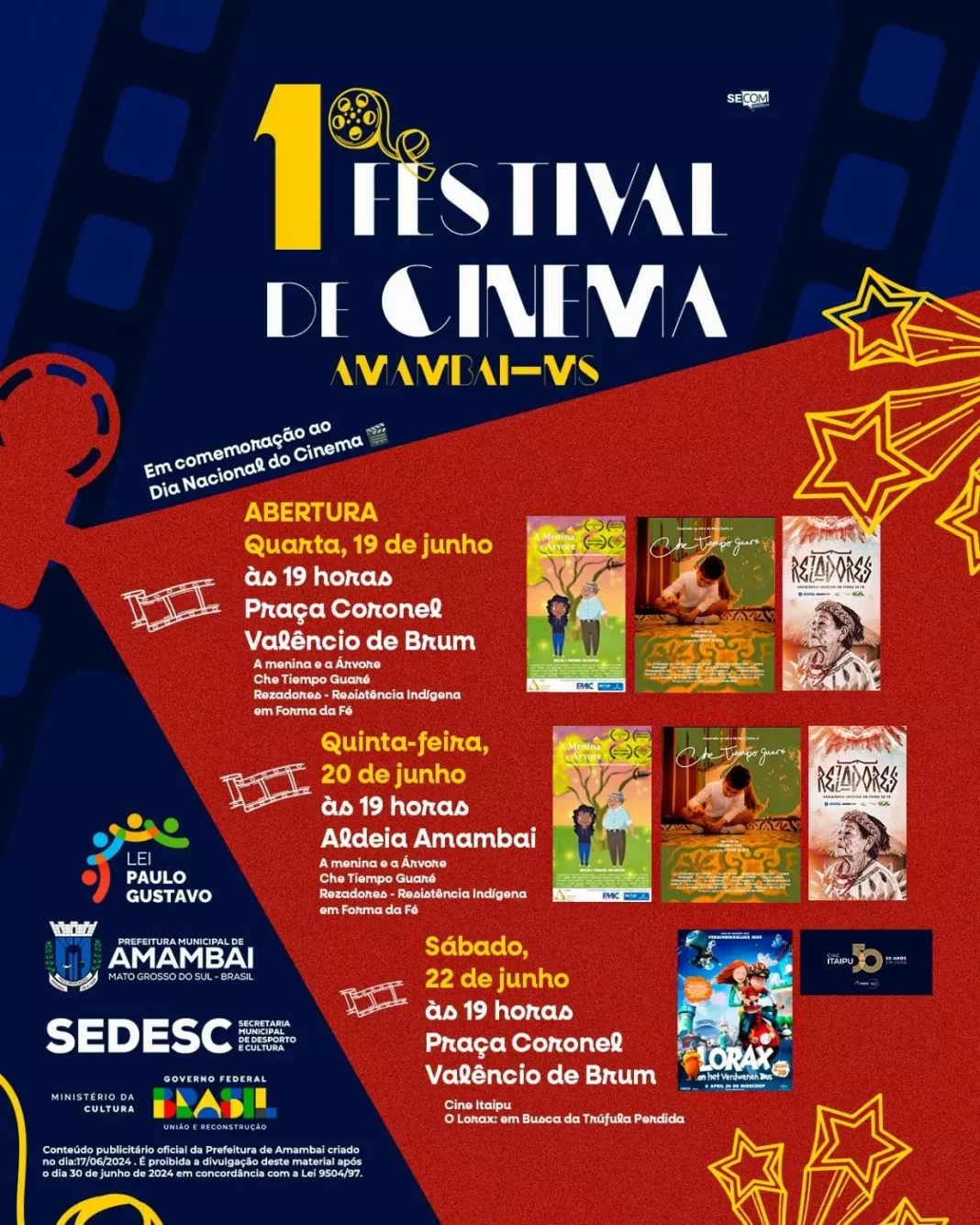 A programação será aberta nesta quarta-feira, 19 de junho, coincidindo com o Dia do Cinema Brasileiro e transformando a cidade em um epicentro de arte e entretenimento, contemplando documentários e filmes produzidos e contracenados por artistas amambaienses.
