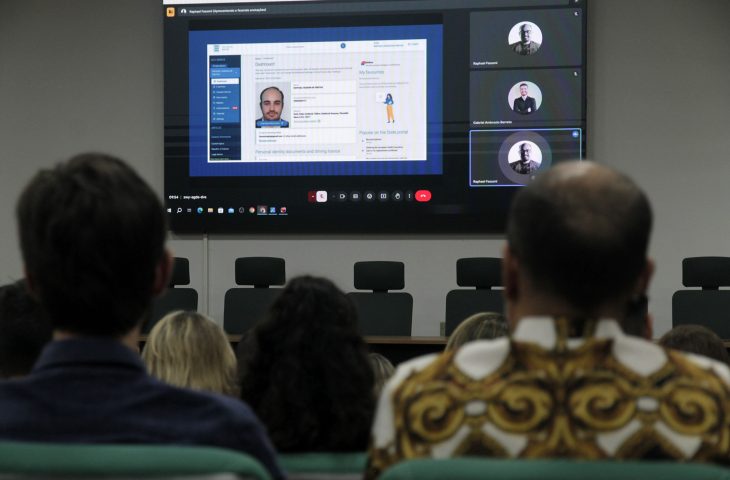 Raphael Fassoni, CEO da Estônia Hub, e Gabriel Barreto, Assistente de Projetos Internacionais da organização, participaram remotamente por videoconferência e reforçaram o princípio estoniano do cidadão centrismo, que coloca o cliente no centro dos serviços públicos digitais.