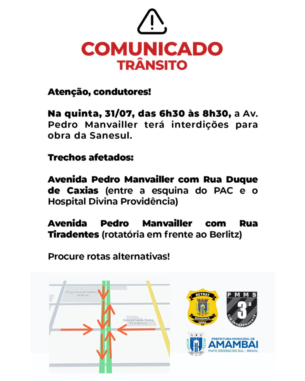 A Prefeitura de Amambai informa que, nesta quinta-feira, dia 31 de julho, a Avenida Pedro Manvailler passará por interdições temporárias em alguns trechos para a realização de obras da Sanesul, que fará a abertura de velas na tubulação. A ação está prevista para ocorrer das 6h30 às 8h30.