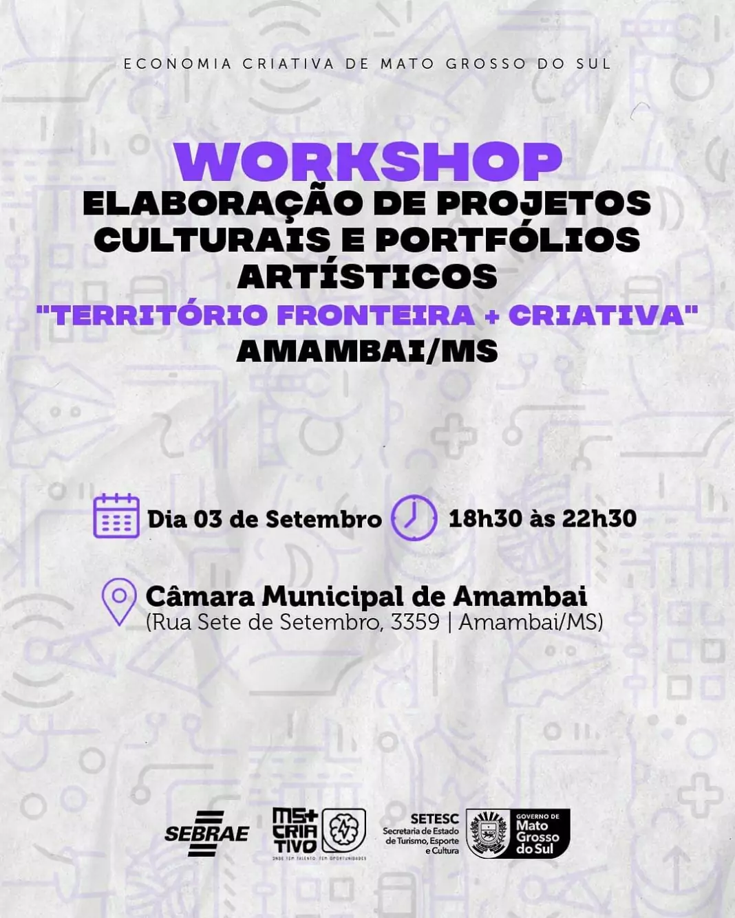A Prefeitura de Amambai, em parceria com o Sebrae/MS, a Secretaria de Estado de Turismo, Esporte e Cultura (SETESC) e o programa MS+Criativo, convida artistas, produtores culturais e toda a comunidade para participar do Workshop de Elaboração de Projetos Culturais e Portfólios Artísticos – “Território Fronteira + Criativa”.