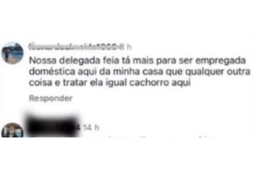 A delegada também foi alvo de comentários misóginos. Um deles dizia que Thays Bessa estaria “noiada” no trabalho. A Polícia Civil classificou os ataques como graves, por serem direcionados a uma servidora pública que atua com respeito e dedicação.