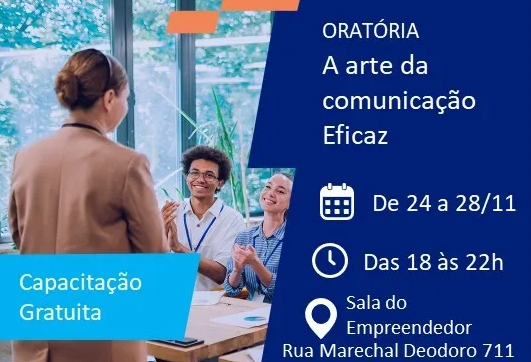 A primeira delas é o curso “Oratória: A arte da comunicação eficaz”, que será realizado de 24 a 28 de novembro, das 18h às 22h, na Sala do Empreendedor. A capacitação vai abordar técnicas práticas para melhorar a expressão verbal, postura e autoconfiança ao falar em público, contribuindo para uma comunicação mais assertiva em reuniões, apresentações e negociações.