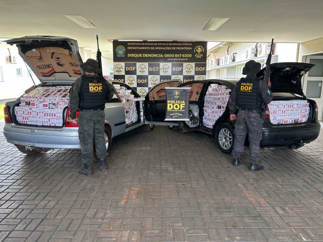 Policiais militares do DOF (Departamento de Operações de Fronteira) apreenderam, neste sábado (7), em Rio Brilhante, um GM Astra e um VW Polo carregados com 1.750 pacotes de cigarros contrabandeados do Paraguai. Na ação, ninguém foi preso.