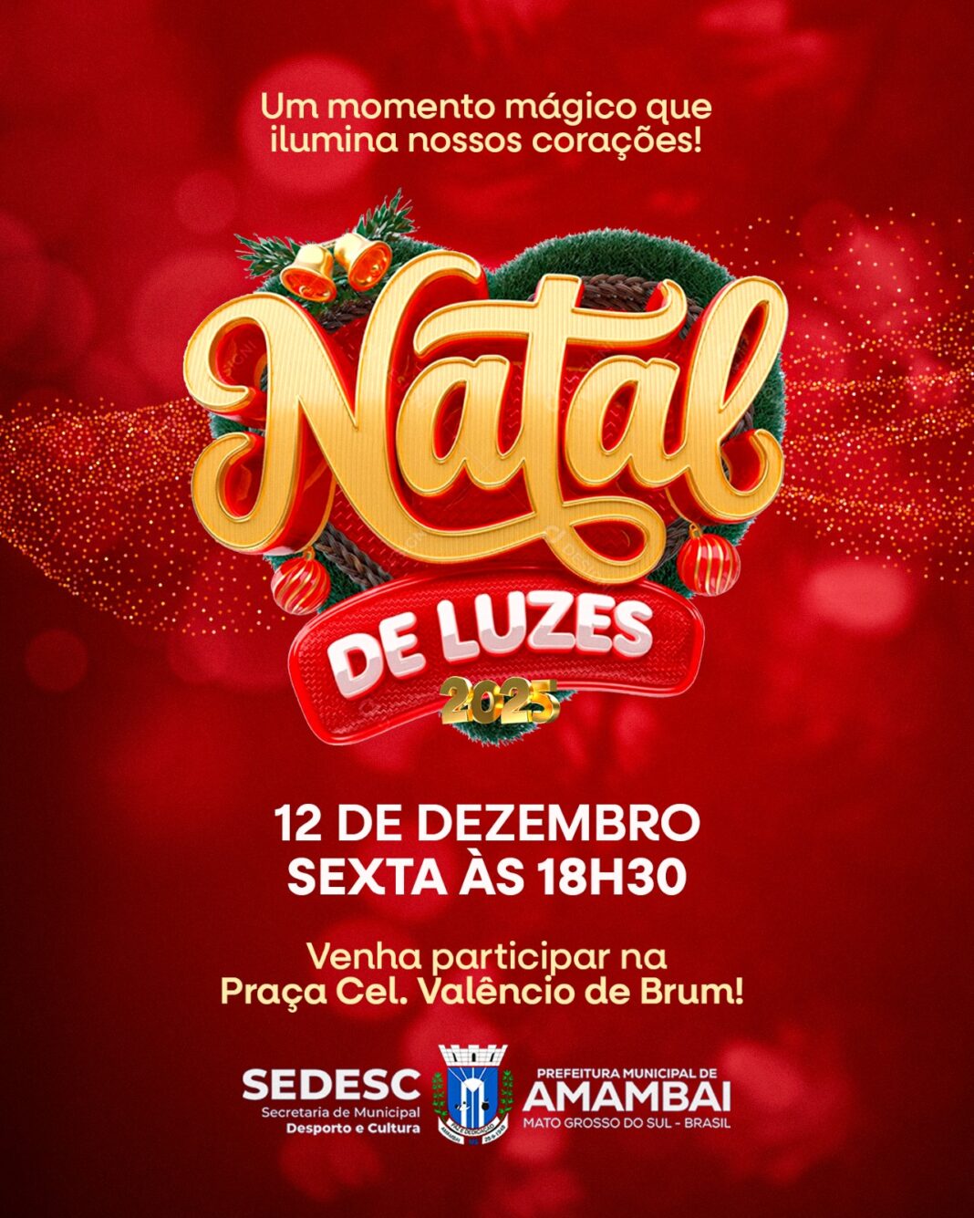 Nesta sexta-feira, 12 de dezembro, Amambai realiza a inauguração do Natal de Luzes, a partir das 18h30, na Praça Coronel Valêncio de Brum. O evento é promovido pela Prefeitura de Amambai, por meio da SEDESC, e promete abrir oficialmente a temporada natalina na cidade.