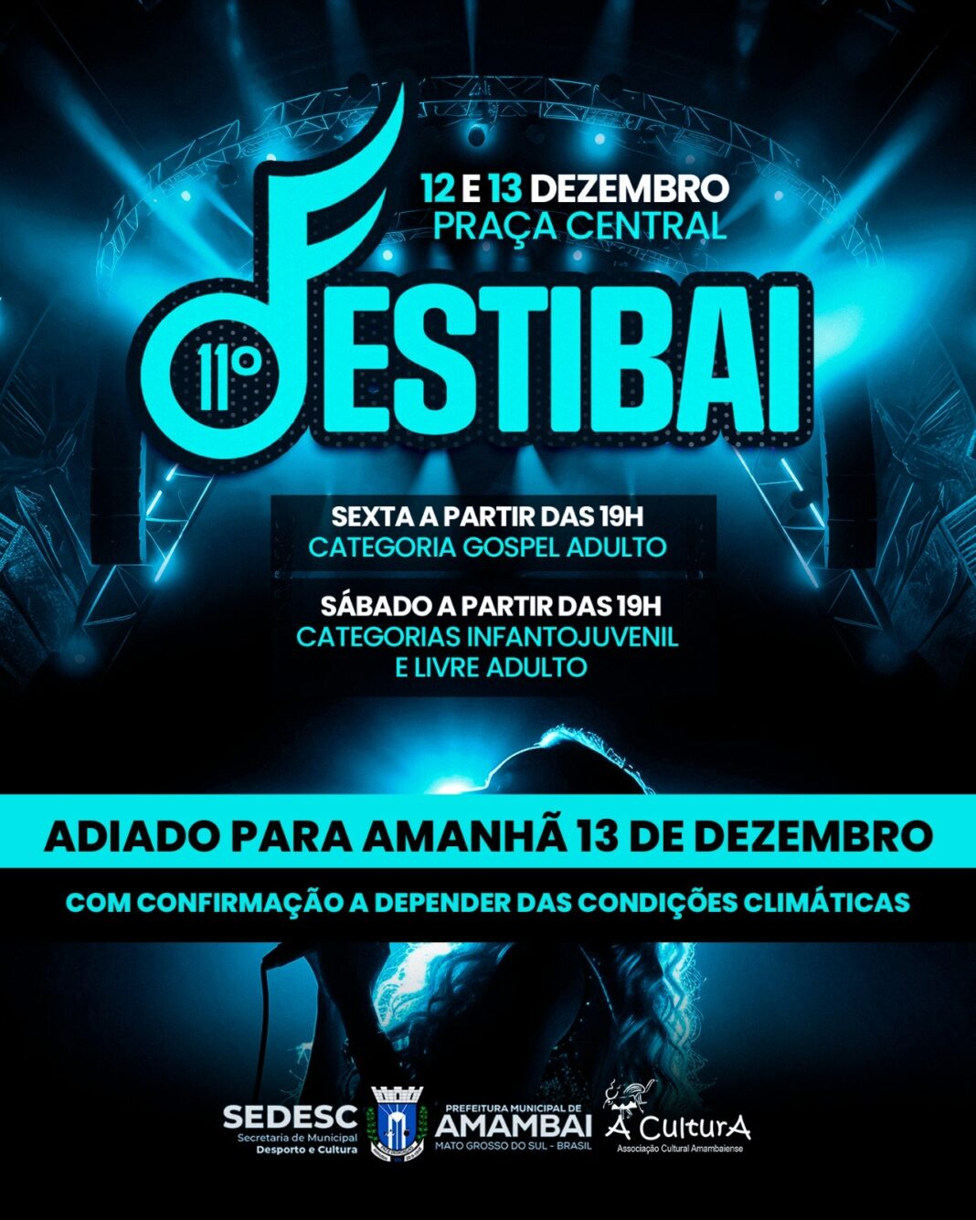 Devido aos fortes ventos e chuvas que atingiram Amambai nesta sexta-feira (12), a abertura do 11º Festibai foi adiada para este sábado, 13 de dezembro, conforme as condições climáticas permitirem.