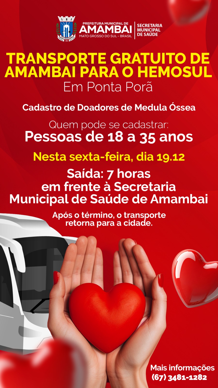 A Prefeitura de Amambai, por meio da Secretaria Municipal de Saúde, disponibiliza transporte gratuito para moradores interessados em realizar o cadastro como doadores de medula óssea no HEMOSUL de Ponta Porã. A ação acontece nesta sexta-feira, dia 19, e faz parte das iniciativas do município voltadas à promoção da solidariedade e ao aumento do número de doadores no banco nacional.