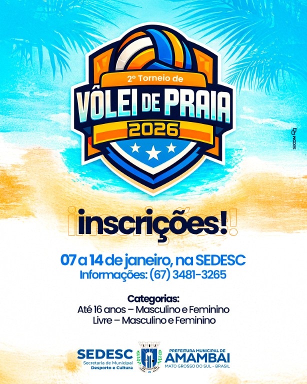 A Prefeitura de Amambai, por meio da Secretaria Municipal de Desporto e Cultura (SEDESC), abre a partir do dia 7 de janeiro as inscrições para o Torneio de Vôlei de Praia, que será realizado na Praça Orlando Viol. A competição tem início previsto para o dia 19 de janeiro.