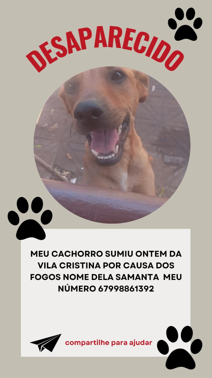 Samanta é de porte médio e qualquer informação que possa ajudar a localizá-la pode ser repassada pelo telefone (67) 9 9886-1392.