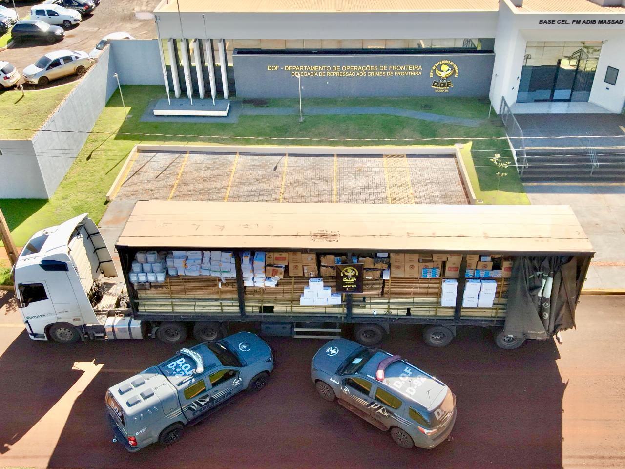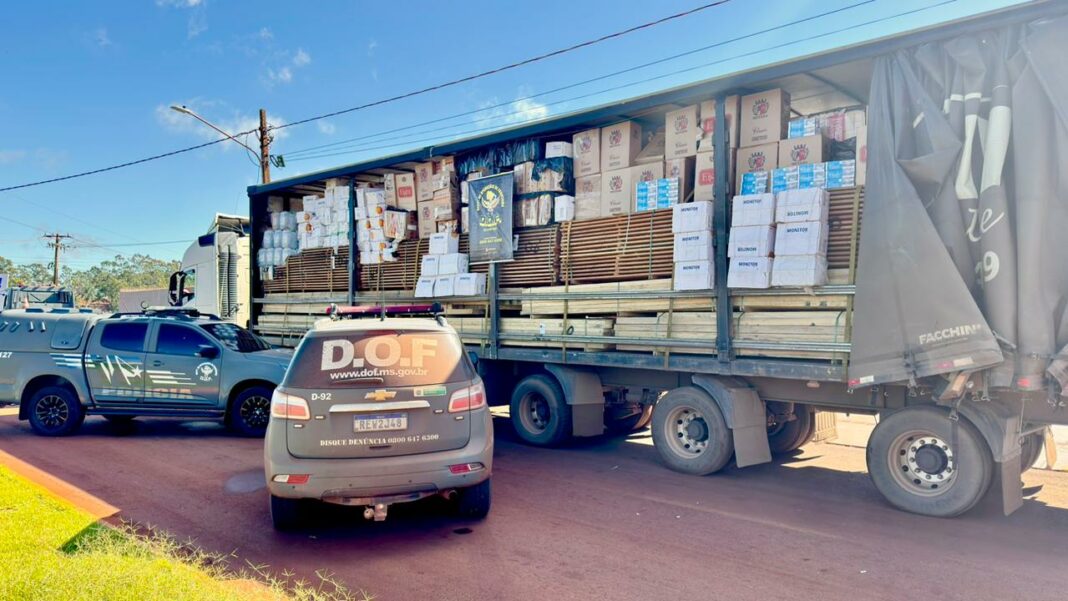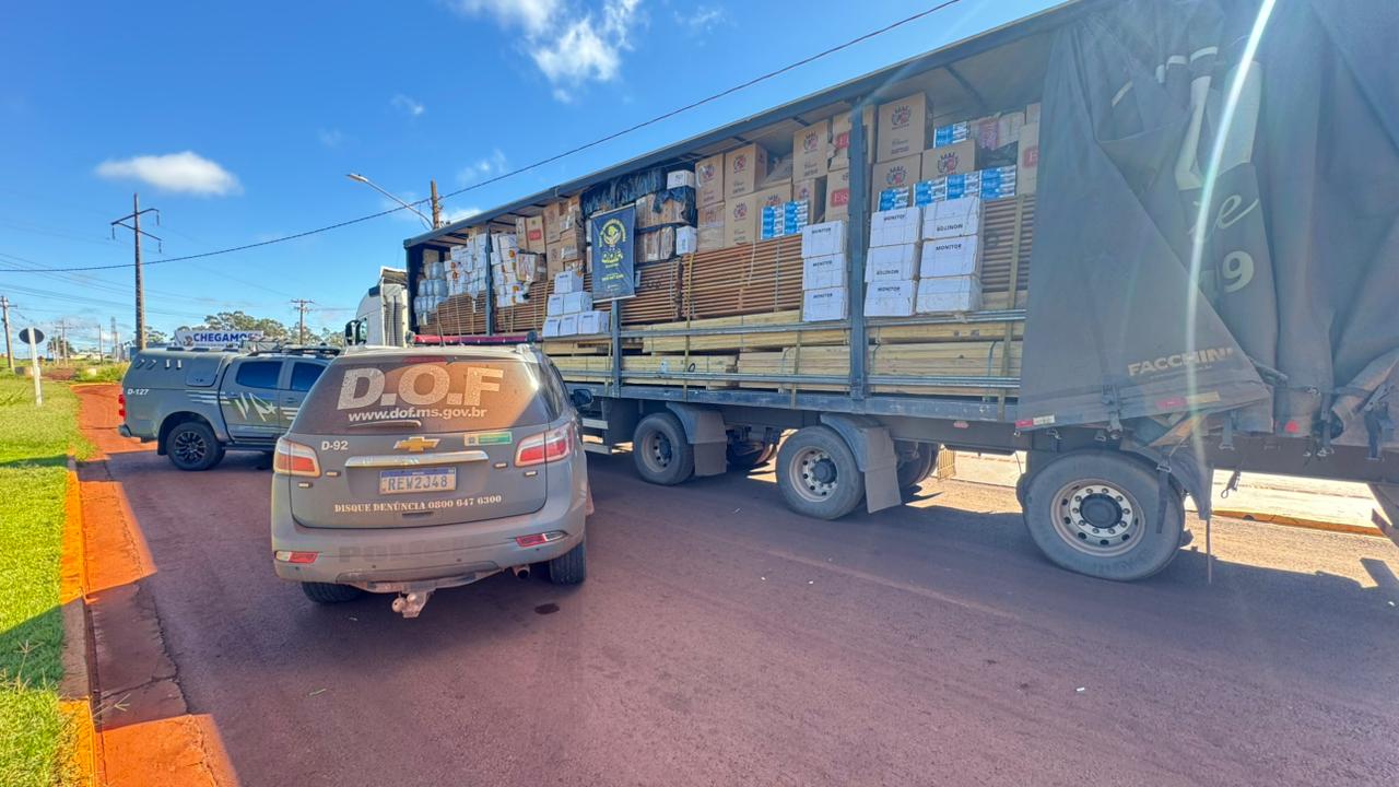 Policiais militares do DOF (Departamento de Operações de Fronteira) apreenderam, nesta terça-feira (14), na BR-267, em Nova Alvorada do Sul, 10 mil pacotes de cigarros contrabandeados do Paraguai, 1.350 quilos de agrotóxicos acondicionados em sacos e outros 400 litros do mesmo produto em galões. Os materiais ilícitos eram transportados em uma carreta carregada com madeira.