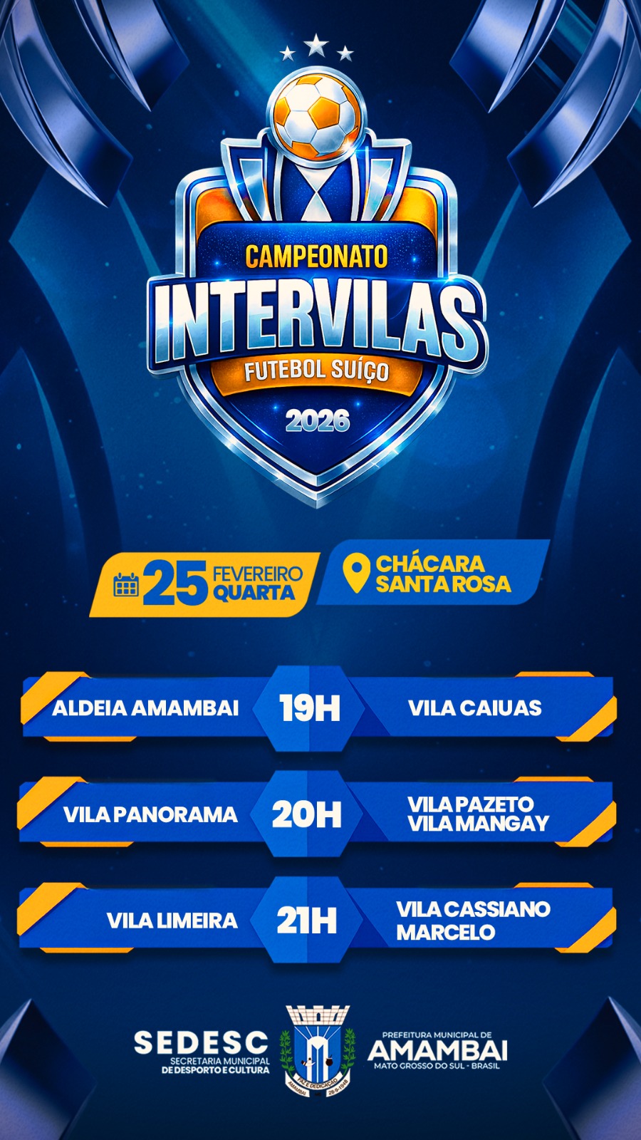 O Campeonato Intervilas 2026 continua movimentando o esporte amambaiense e nesta quarta-feira, dia 25, a bola volta a rolar na Arena Santa Rosa com mais três confrontos que prometem agitar as torcidas.
