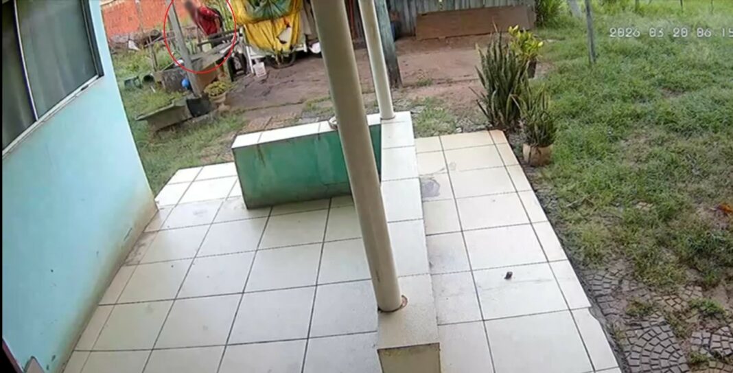Um vídeo gravado na manhã desta sexta-feira, 20 de março, mostra o momento em que o suspeito entra no quintal da casa.
