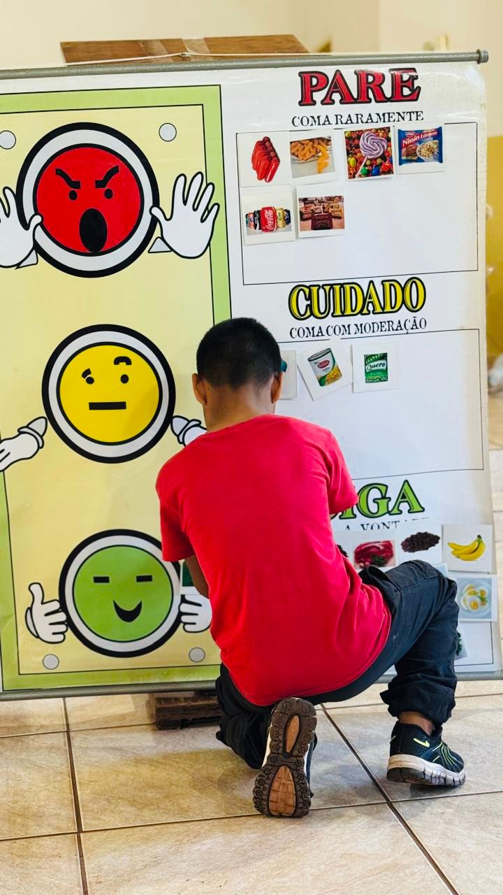 Ao final da visita, foi realizada uma atividade lúdica, abordando a classificação dos alimentos in natura, processados e ultraprocessados. Por meio de dinâmicas, os estudantes participaram ativamente, refletindo sobre seus hábitos alimentares e a importância de escolhas mais saudáveis.