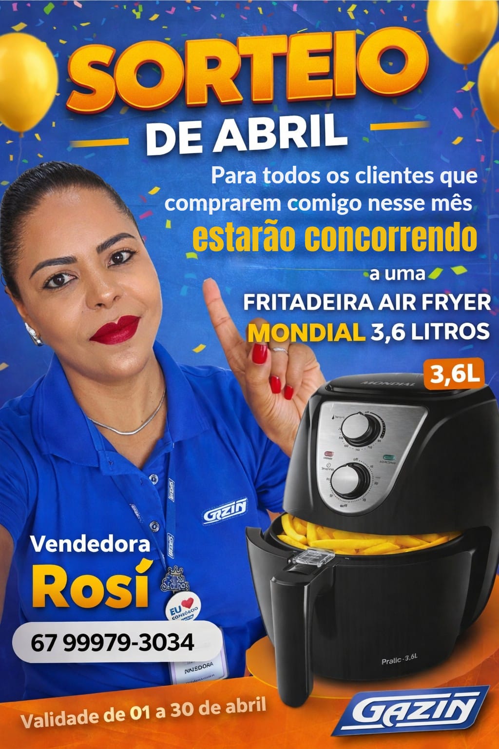 De acordo com Rosí, todos os clientes Gazin que realizarem compras com ela entre os dias 1º e 30 de abril estarão automaticamente concorrendo a uma fritadeira air fryer Mondial de 3,6 litros.