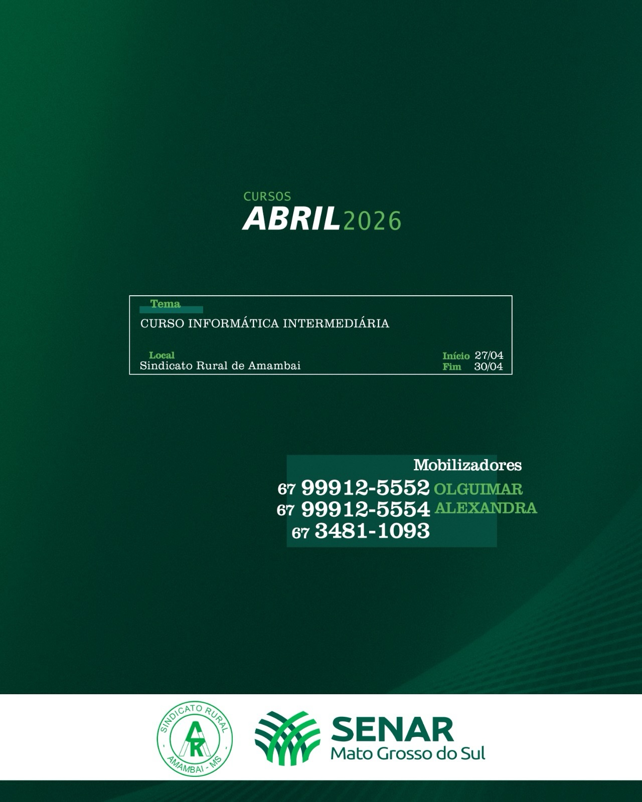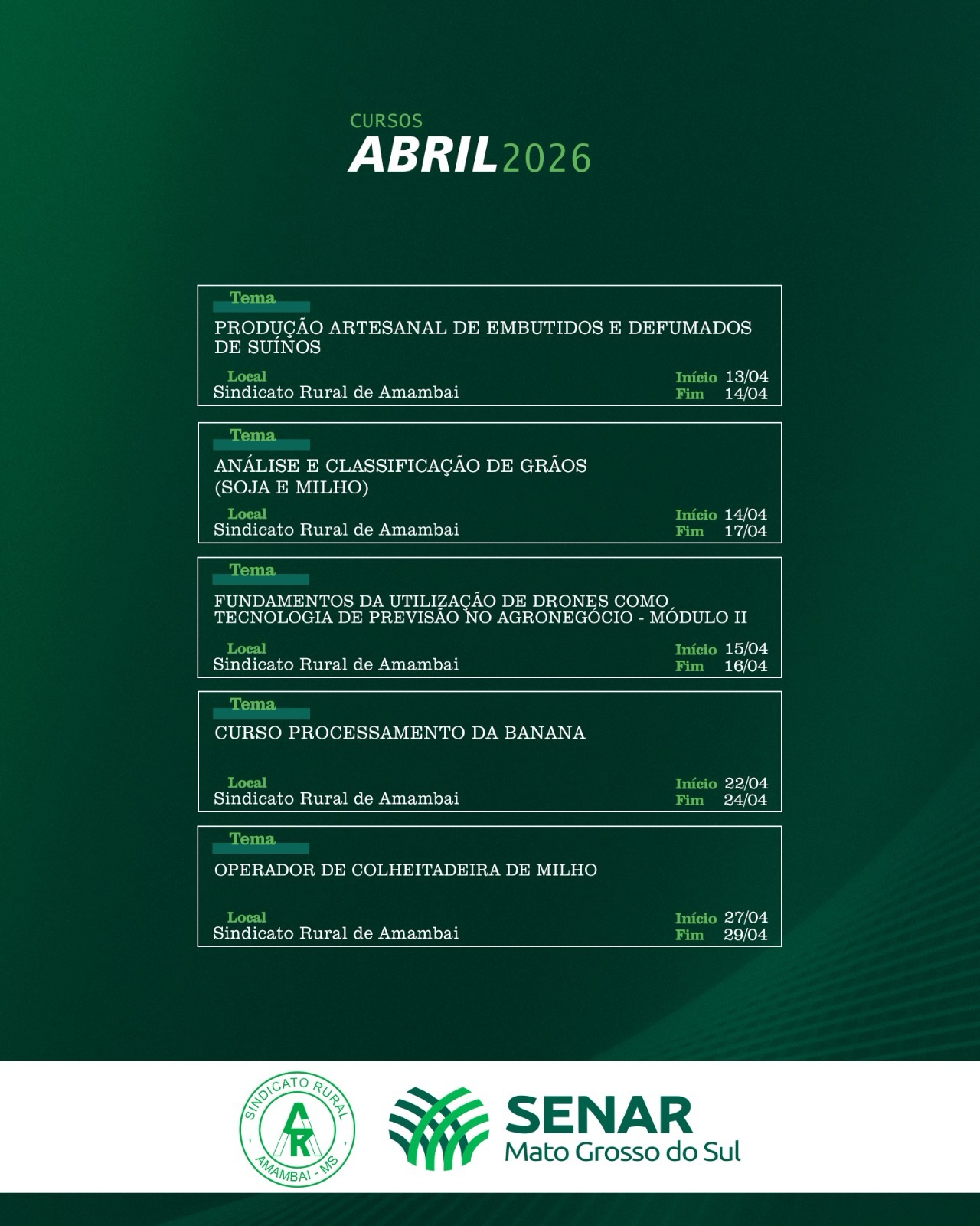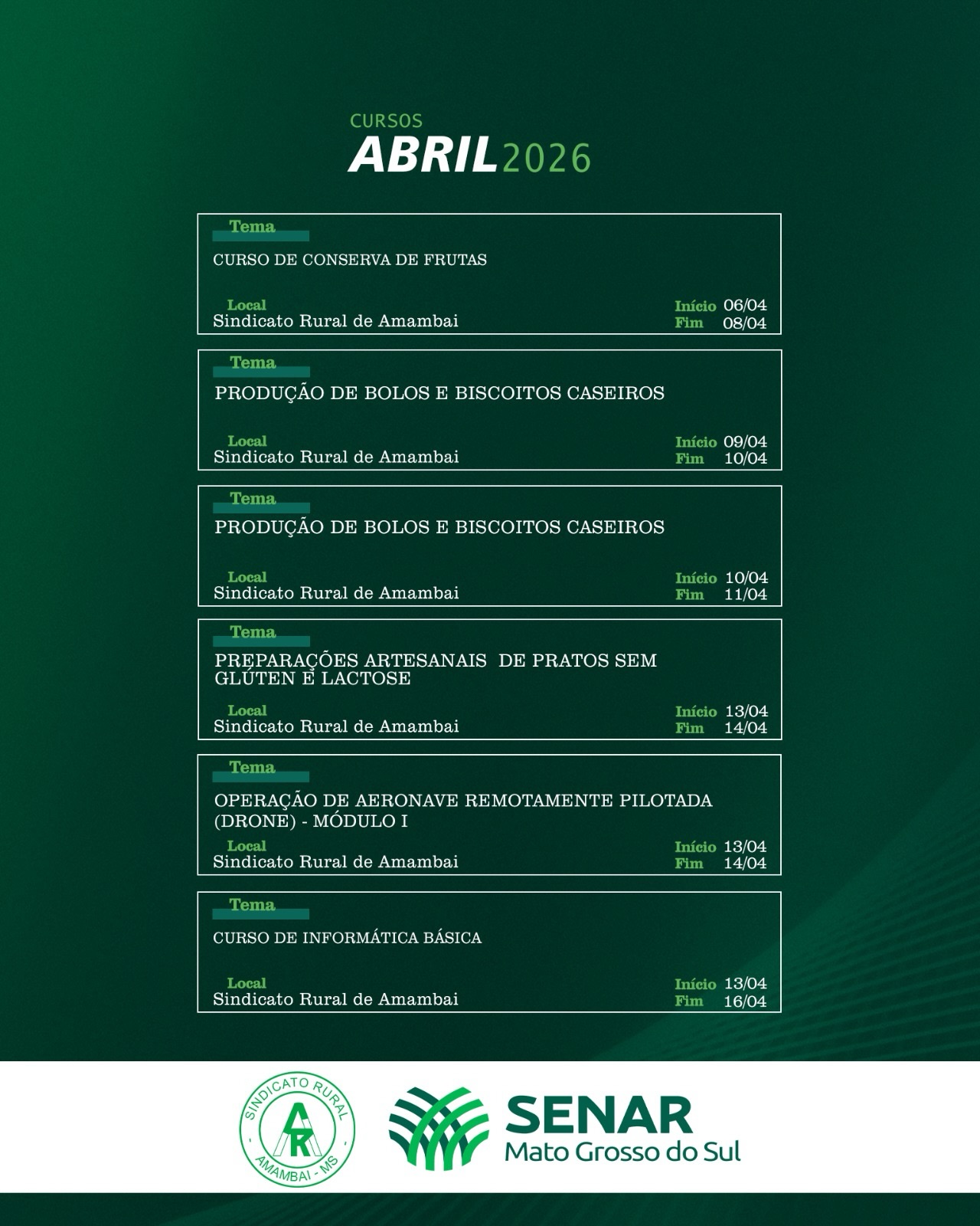 O Sindicato Rural de Amambai, em parceria com o Senar Mato Grosso do Sul, divulgou a programação de cursos gratuitos que serão ofertados ao longo do mês de abril de 2026. As capacitações abrangem diversas áreas, com foco na qualificação profissional e no fortalecimento das atividades no campo e também no meio urbano.